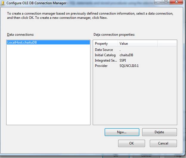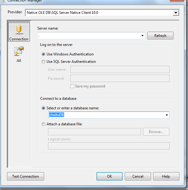 Connection: select new connection, a window occurs, specify the data source information give server name and database information and test the connection
