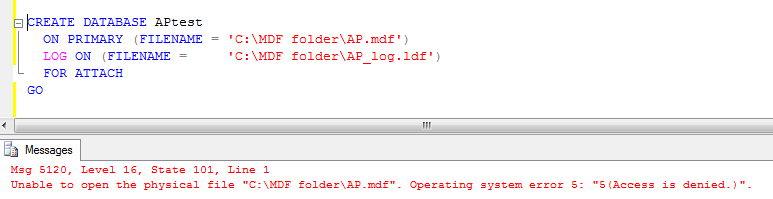 Means your windows login did not have the permissions for the folder where you have the mdf file.